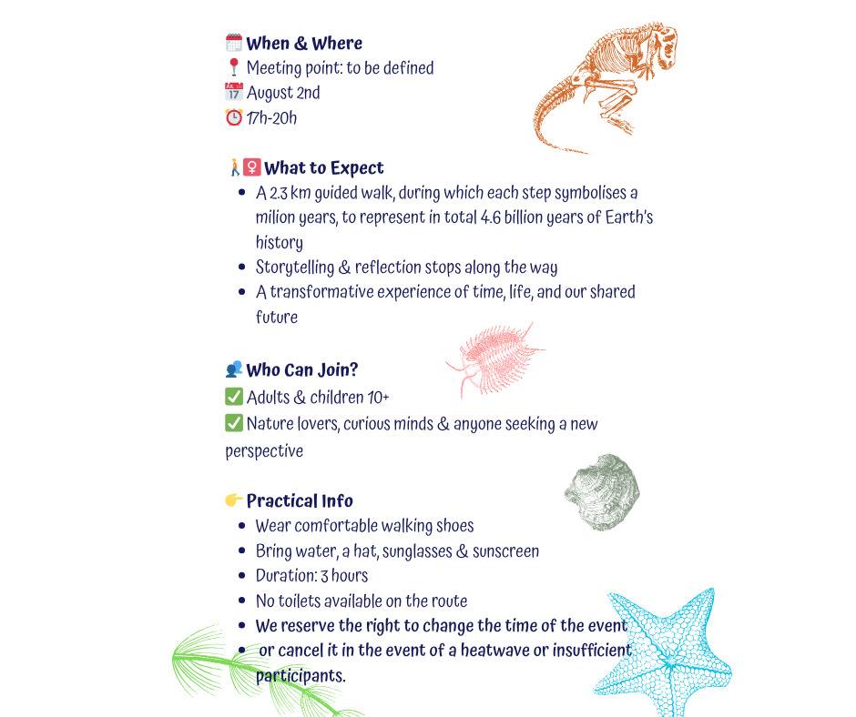 Zakoračite s nama u duboko vrijeme na stazu dugačku 2,3 kilometra gdje svaki korak predstavlja 1 milijun godina. Kroz ovu posebnu šetnju proći ćemo kroz priču o razvoju našeg plavog planeta i beskrajno rijetkog i vrijednog života na njoj.